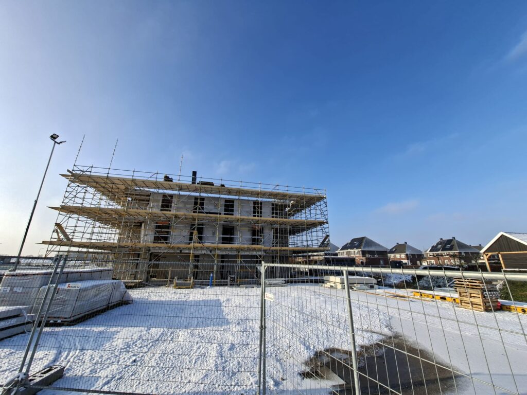 Winterse taferelen in Winterheide in Wolvega. Sneeuw, ijzel en vorst geven het bouwterrein een wit randje, maar zodra het kan wordt er doorgewerkt. Op elke werkbare dag vordert de bouw weer een stap, richting een mooie nieuwe woonplek. Is een comfortabel en duurzaam appartement in de groene en waterrijke Lindewijk iets voor jou? Neem dan contact op met Makelaardij Hoekstra.